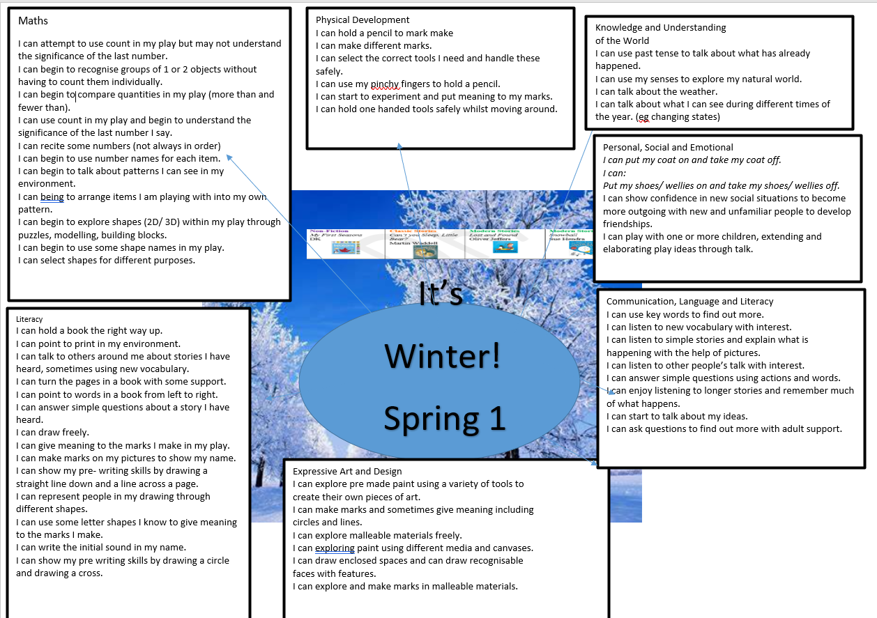 Below, our curriculum map shows how we will develop our skills and knowledge across the areas of the EYFS. Our first half-term will be focusing on our Topic of 'Winter'